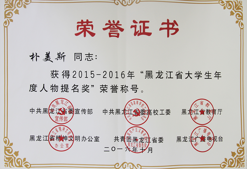 本网讯(记者 何振东)11月8日,2015—2016年度“黑龙江省高校教师年度人物、大学生年度人物暨道德模范人物(群体)”颁奖典礼在黑龙江大学举行。经过推荐申报、初评审核、公众投票、综合评审等环节评选,我校外国语学院学生朴美斯荣获2015—2016年度“黑龙江省大学生年度人物提名奖”。
