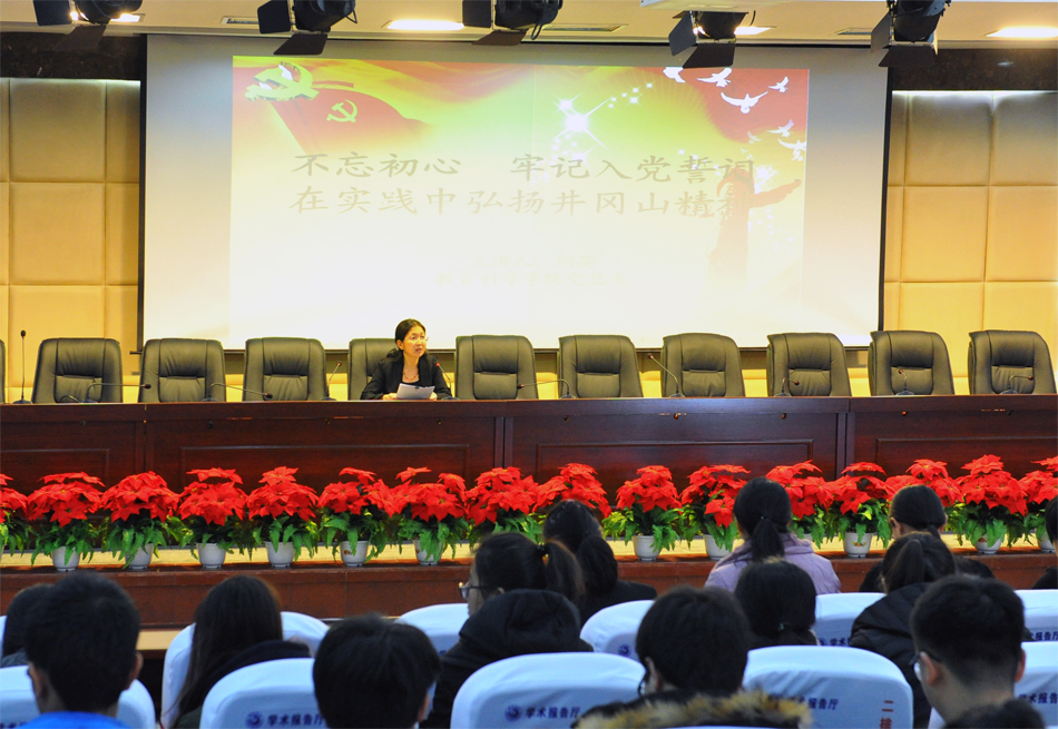 本网讯(特约记者 胡楠 学生记者 朱诗韵)为进一步提高师生党员干部、学生入党积极分子的政治思想、理论水平和工作能力,11月2日教育科学学院党总支书记闫英在求知楼报告厅主讲了“不忘初心、牢记入党誓词、在实践中弘扬井冈山精神”的讲座。