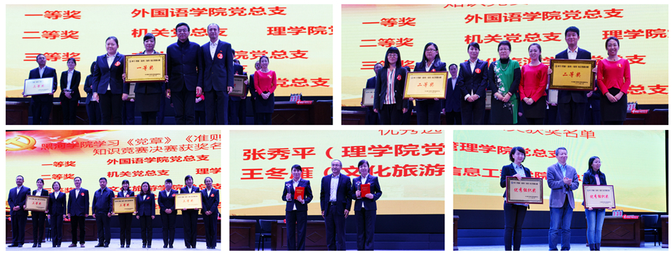 在竞赛过程中,参赛选手各显风采,必答题准确无误,团队共答题齐心协力,抢答题稳准有序,风险题胆大心细。同时,为确保比赛的公平、公正,决赛现场设有仲裁组,对有异议的答案进行现场仲裁。经过两个小时的激烈比拼,外国语学院党总支代表队荣获比赛第一名,机关党总支、理学院党总支代表队获得第二名,文化旅游学院党总支、图书馆党总支、美术与设计学院党总支代表队获得第三名;经济管理学院党总支、计算机与信息工程学院党总支荣获优秀组织奖;文化旅游学院党总支王冬雁、理学院党总支张秀平荣获最佳选手奖。