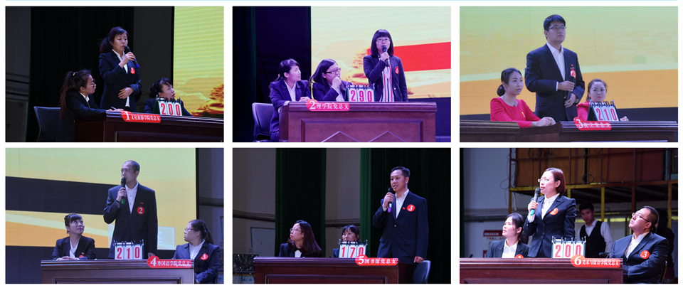本次知识竞赛历时三个月,分为初赛和决赛。初赛为笔试形式,共有16支代表队参赛;决赛为现场竞答形式,分为个人必答题、团队共答题、抢答题和风险题等四个环节。经过初赛的激烈角逐,文化旅游学院党总支、理学院党总支、机关党总支、外国语学院党总支、图书馆党总支、美术与设计学院党总支6支代表队进入决赛。