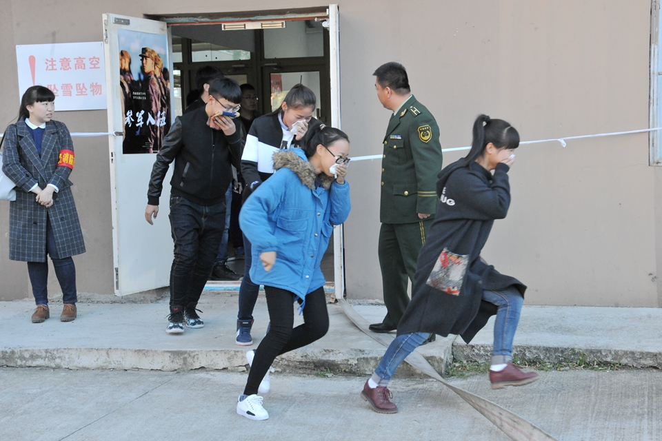 14时整,随着总指挥宣布演练开始,10名消防官兵及楼内工作人员按照预先的消防演习方案立即到达指定岗位,引导楼内学生快速疏散,学生弯着腰、用手帕、毛巾等捂住口鼻,沿着学校指定楼梯口,快速、有序地撤离到安全地带,用时3分钟,师生们全部安全疏散完毕。