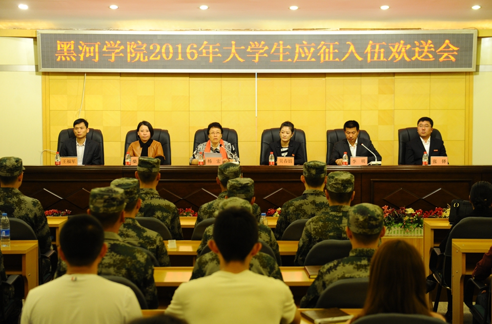 本网讯(记者 赵宇)9月9日下午,学校在明德楼五楼多功能厅举行了2016年大学生应征入伍欢送会,党委副书记杨宏,宣传统战部、学生工作部(处)·武装部、团委、教务处、保卫处等部门负责人及各学院党总支书记和辅导员代表参加了欢送会,热烈祝贺应征入伍的学生携笔从戎。