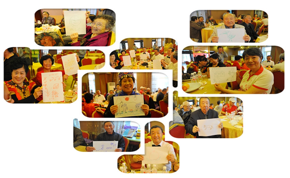 在心理互动游戏环节,老教师们在纸上画出了自己心中所想的图案,一场有趣的涂鸦盛宴悄然荡开。有的教师画了一匹马,寓意老骥伏枥志在千里;有的教师画了一群开心玩耍的孩子,命名为童年的回忆;有的教师画了自己肖像的速写,上面写着“永不老”;还有的教师画了一棵硕果压枝的大树并说:“这颗树代表今天的黑河学院,茁壮成长、万年长青,树枝代表学校所有的教师,真情奉献、桃李满天,果实则代表学校的莘莘学子,学有所成、快乐成长。”