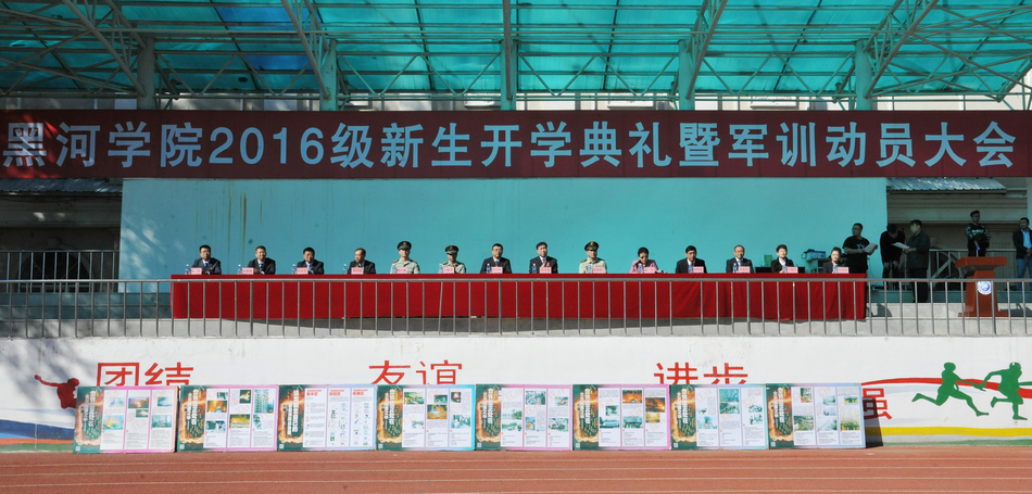 本网讯(记者 何振东 摄影 赵宇)初秋的暖阳尽洒美丽的校园,边城的和风掠过青春的脸庞。8月29日上午,2016级新生开学典礼暨军训动员大会在我校田径运动场隆重举行。黑河军分区副政治委员王振兴大校、黑河市公安消防支队支队长张国祥上校、中国人民解放军65951部队副政治委员魏恒越中校,党委书记曹百瑛、校长贯昌福,党委副书记杨宏、李廷栋,副校长张焕强、车永宏、许海深、丛喜权,总会计师、财务处处长宁艳杰,党委委员、组织部部长邹辉,党委委员、宣传统战部部长吴春娟出席大会。大会由党委副书记杨宏主持。