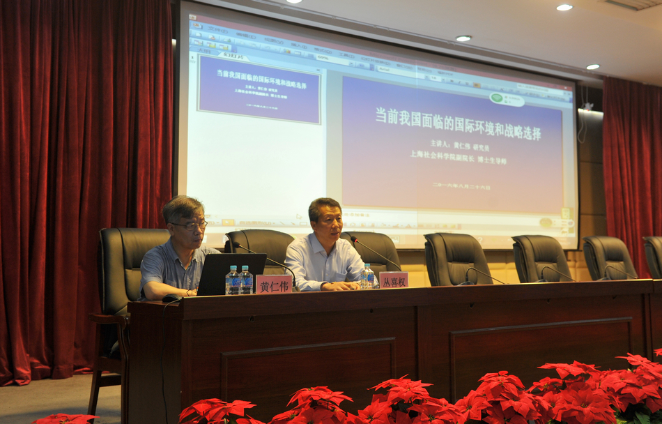 本网讯(记者 何振东)8月26日下午,上海社会科学院副院长黄仁伟研究员在我校求知楼学术报告厅作了题为“当前我国面临的国际环境和战略选择”的学术报告,副校长丛喜权主持报告会。