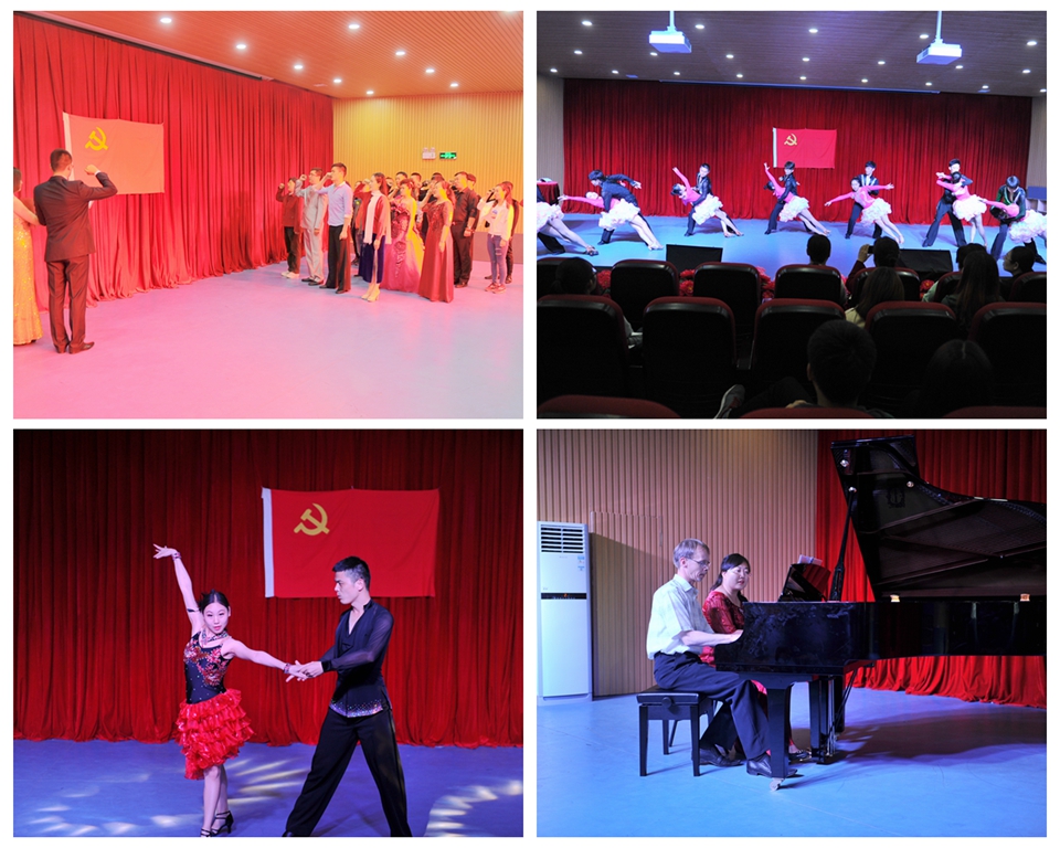 在全体党员庄严地重温入党誓词后,演出正式拉开帷幕。拉丁舞《青青校园》表现了当代大学生的青春活力以及大学生们对成为一名优秀共产党员的向往;竹笛独奏《红星照我去战斗》、萨克斯演奏《党啊,亲爱的妈妈》不仅勾起了对中国革命峥嵘岁月的回忆,也奏出了全院师生对中国共产党的赞美;歌曲《红梅赞》唱腔深沉流畅而又醇厚隽永,展现了英姿飒爽、坚守信仰的革命者形象;中俄教师配合默契的四手联弹《世界的盛宴》将现场气氛推向高潮;演出在歌曲《走进新时代》中落下帷幕。