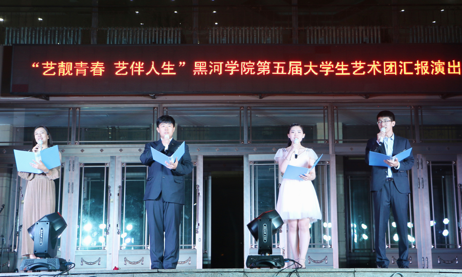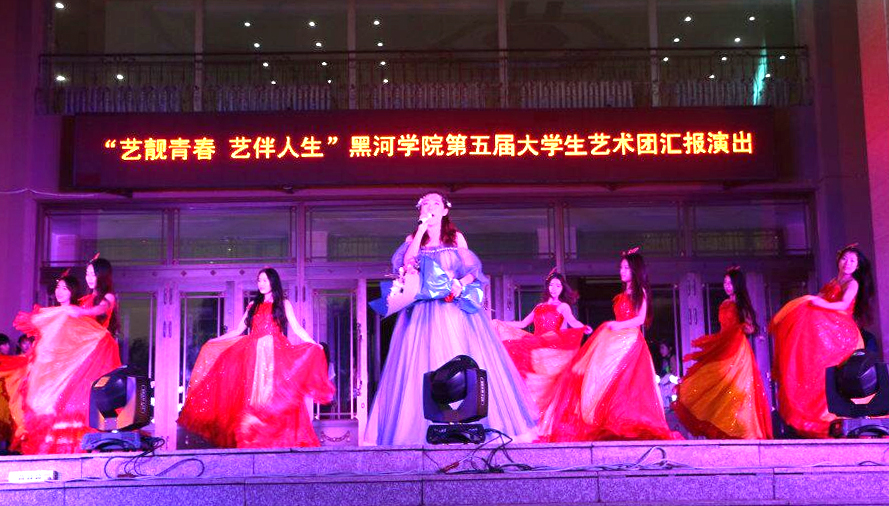 本网讯(特约记者 梁云婴)6月24日晚,由共青团黑河学院委员会主办,大学生艺术团承办的“艺靓青春 艺伴人生”黑河学院第五届大学生艺术团汇报演出在明德楼前举行。我校800余名师生共同观看了本次汇演。