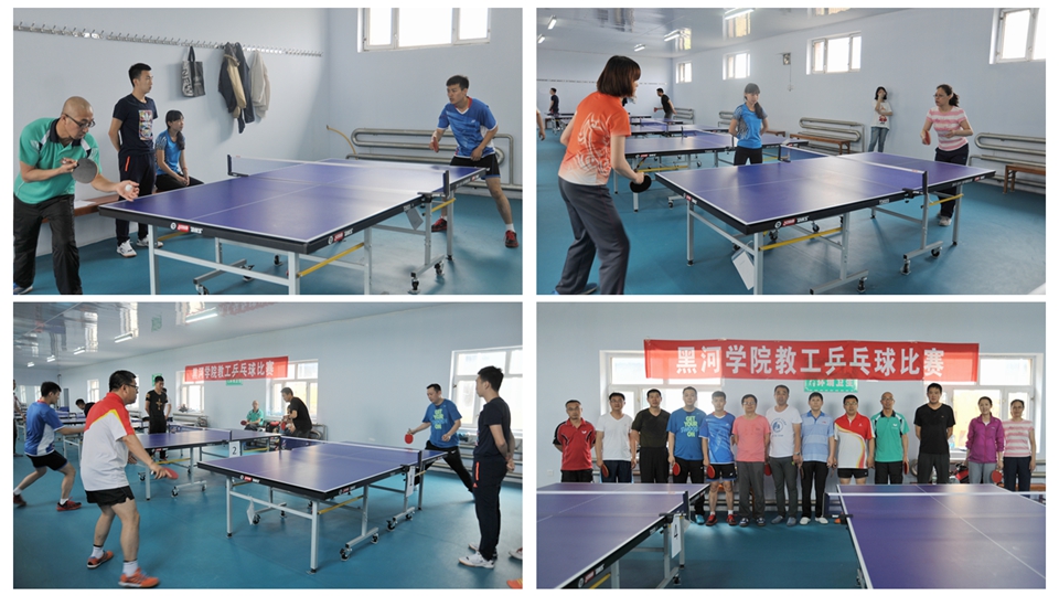 本网讯(特约记者 张双印 摄影 胥涵)为活跃广大教职工业余文化生活,促进学校全民健身运动的开展,6月20日,由校工会主办,校教职工乒乓球协会承办的黑河学院2016年教职工乒乓球比赛如期举行。经过激烈角逐,外国语学院崔德贵获得男子单打冠军,体育学院李井霞获得女子单打冠军;体育学院张明德、李井霞获得混双冠军。体育学院获得团体冠军。