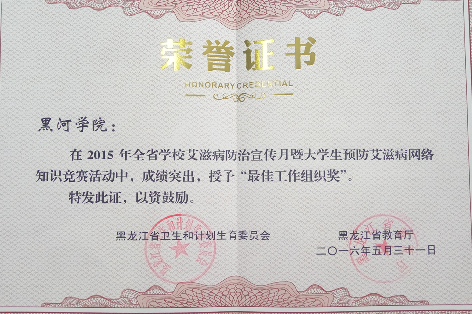 本网讯(特约记者 舒展)日前,黑龙江省教育厅、省卫生和计划生育委员会公布了2015年预防艾滋病网络知识竞赛评选结果,我校荣获“最佳工作组织奖”。