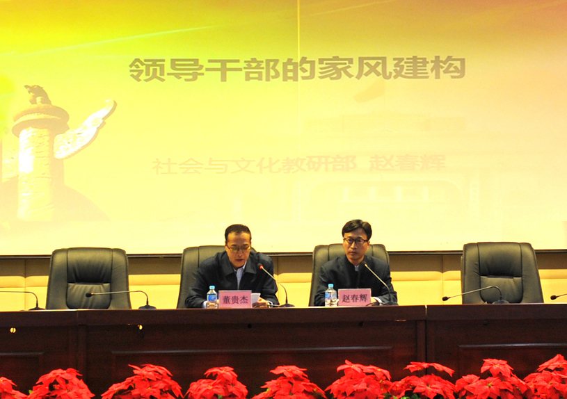 本网讯(记者 何振东)为深入推进我校“两学一做”学习教育和党风廉政建设工作,加强对我校党员干部的廉洁齐家、廉洁从教教育,5月25日,黑龙江省委党校、省行政学院社会与文化教研部赵春辉副教授应邀在我校求知楼报告厅作了题为《领导干部的家风建构》专题讲座。学校领导班子成员、副科级以上干部、全体党员聆听了讲座。讲座由纪委书记董贵杰主持。