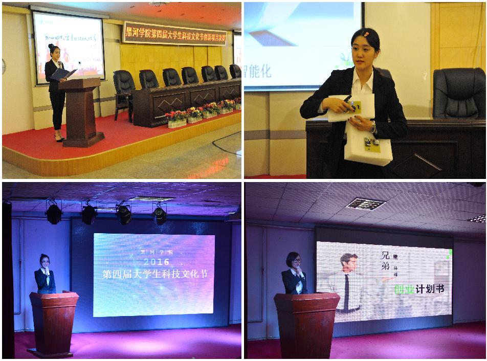 本网讯(记者 何振东 鄢占才)5月11日下午,由学校党委主办、团委承办,以“创新点亮未来 创业成就梦想”为主题的第四届大学生科技文化节创新项目和创业项目决赛分别在明德楼多功能厅和润德楼学生活动中心同时举行。学校纪委书记董贵杰、副校长丛喜权亲临现场观看比赛,黑河市小微企业协会常务副会长、秘书长李海及来自各学院(研究所)的14名教师担任大赛评委。