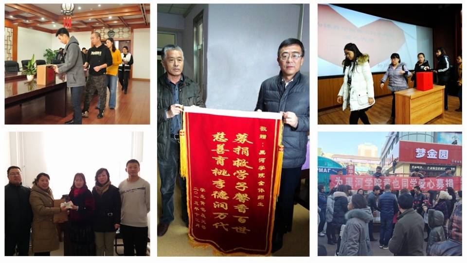 黄也是我校体育学院2015级体教3班的学生,2015年9月被诊断出患有骨肉瘤,俗称骨癌。黄也家住辽宁葫芦岛农村,家境困难,父母以务农为生,80万左右的巨额医疗费用让这个本就不富裕的家庭举步维艰。“关爱生命,救济苍生”。当黄也同学患病的消息传来,学校领导高度重视,在第一时间部署、动员全校力量捐款救治,一场营救黄也同学的战役在校园迅速打响。广大师生慷慨解囊,体育学院的办公室不停地接到来自学校领导和各部门老师打来的电话,询问什么样的方式能最快地把钱款捐给黄也;体育学院的学生干部利用课余时间手捧捐款箱走向社会,进行爱心募捐活动;各学院的师生们以班为单位纷纷组织捐款活动,有的老师和同学通过银行账号汇款、微信转账等方式献出爱心后,依旧前来捐助。经过不到一个月的时间,全校师生的爱心捐款总额达到189729.3元。此外,学工部、体育学院还向黑河市红十字会、社保基金申请了社会援助。