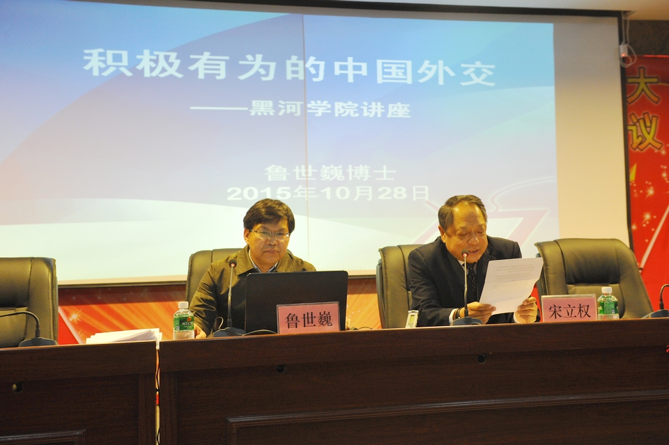 本网讯(记者 赵宇)10月28日下午,黑河市人民政府副市长、我校俄罗斯研究所特聘研究员鲁世巍博士做客“北疆讲坛”,为师生们作了题为“习近平时代积极有为的中国外交”学术报告。副校长宋立权、科研处处长宁艳红、思想政治理论课教研部主任姜丽萍、思想政治理论课教研部全体教师及俄语系、历史系、国际教育学院学生代表近400人聆听了报告。报告会由副校长宋立权主持。