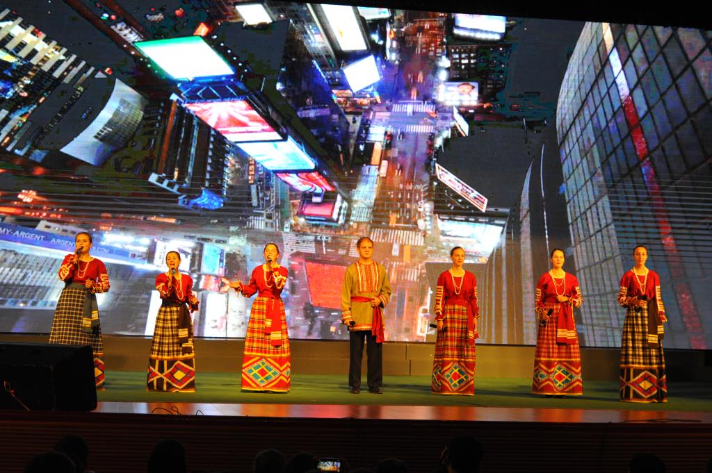 民乐合奏《春节序曲》拉开了中俄民族风情展演的序幕。黑河学院青年师生表演的京剧《打虎上山》,舞蹈《战旗》,歌伴舞《中国范儿》等节目让俄罗斯学生感受到了中国文化艺术的无限魅力;俄罗斯舞蹈《阿拉比卡》赢得台下阵阵掌声,歌曲《世界上没有任何地方比得上我的故乡》展现了独具俄罗斯特色的异域风情。中俄歌曲联唱《红太阳照边疆》《小路》《青春舞曲》《喀秋莎》传递着中俄两国青年的友好情谊。