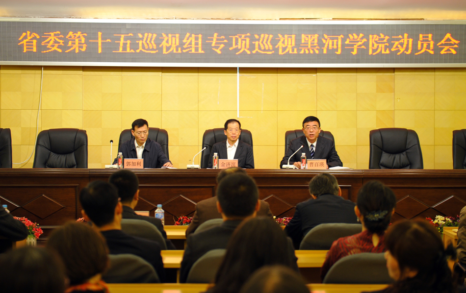 巡视组组长金济滨代表省委巡视工作领导小组回顾了中国共产党巡视工作发展的历程,阐释了《中国共产党巡视工作条例》对于巡视工作的要求和巡视工作的基本程序,对巡视组做好巡视工作和黑河学院党委接受巡视监督提出了具体要求,一要站在全面从严治党的高度,充分认识开展巡视工作的重要作用,深刻理解巡视工作是顺党心合民意的党内监督和群众监督相结合的重要形式。二要突出巡视重点,发挥巡视利剑作用,要毫不动摇地聚焦党风廉政建设和反腐败斗争这个中心,紧扣政治纪律、廉洁纪律、组织纪律、群众纪律、工作纪律和生活纪律“六大纪律”,着力查找违反政治纪律和政治规矩的问题,违反廉洁纪律、以权谋私、贪污贿赂、腐化堕落的问题,违反组织纪律、违规用人、拉票贿选、买官卖官的问题,违反群众纪律、工作纪律、生活纪律及搞形式主义、官僚主义、享乐主义、奢靡之风的问题,特别要注重了解十八大以后、中央八项规定出台以后、党的群众路线教育实践活动以后的顶风违纪问题。要通过巡视工作,强化震慑,唤起党规党纪意识。三要强化责任担当,巡视组将加强与黑河学院主要负责人的沟通,充分发扬民主,发现问题,提出整改意见,实事求是地向省委汇报巡视工作情况;黑河学院各级领导干部要积极支持、配合,共同完成好巡视任务。