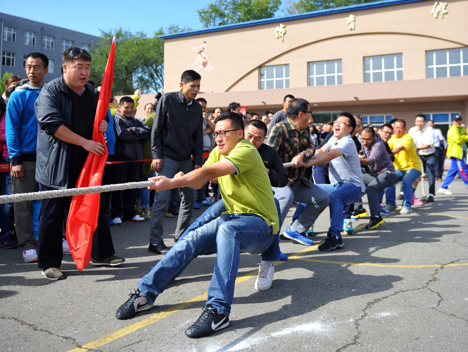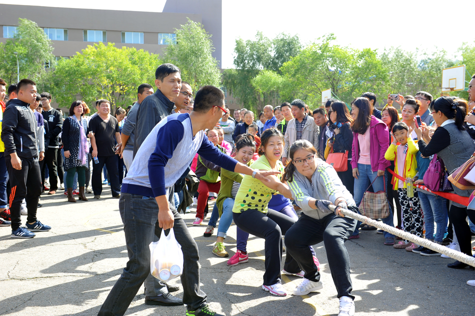 在运动会中还有一项活动是师生们最感兴趣和最关注的,那就是趣味运动会,“拔河”、“勇往直前”、万米异程赛跑等项目妙趣横生。场上选手愉快比赛,场下师生尽兴喝彩,场面热闹非凡。