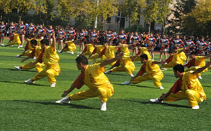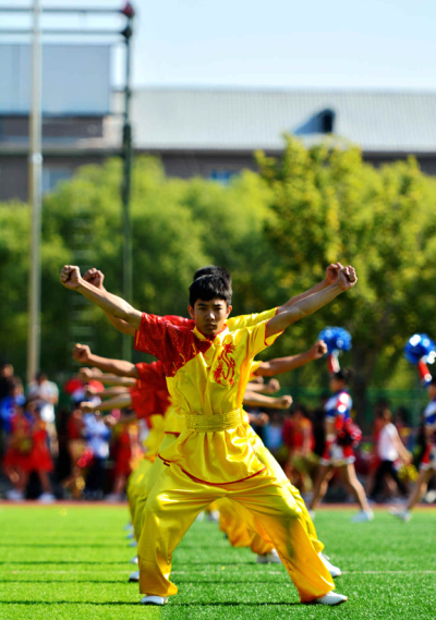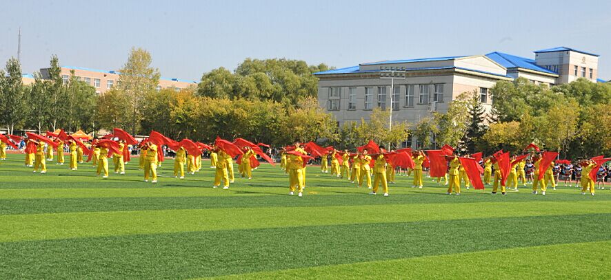 离退休老干部工作处组织的由63位离退休老职工表演的太极拳以及各学院带来的团体操,武术表演。