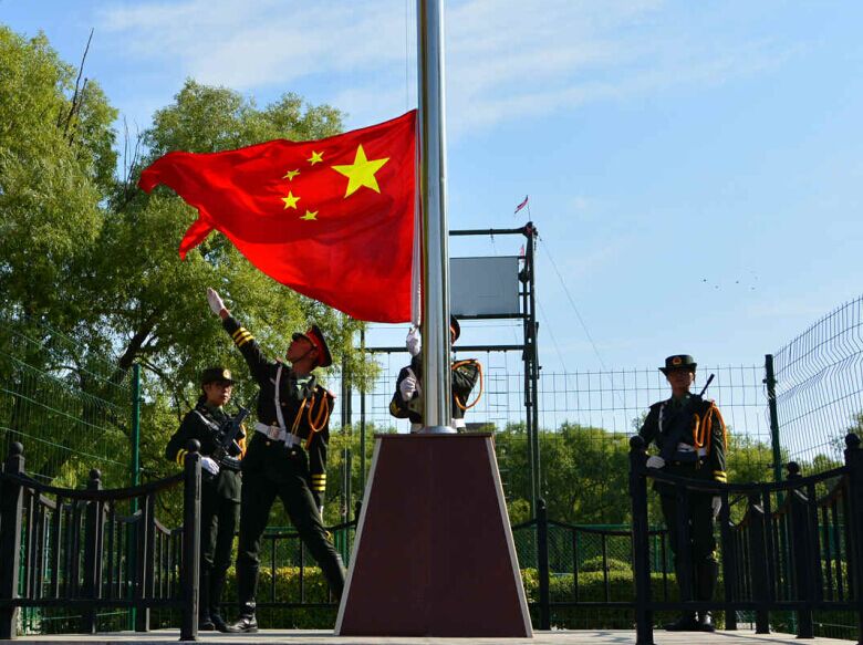 音乐学院管乐队奏响中华人民共和国国歌,鲜艳的五星红旗在运动场冉冉升起,迎风飘扬。