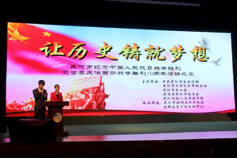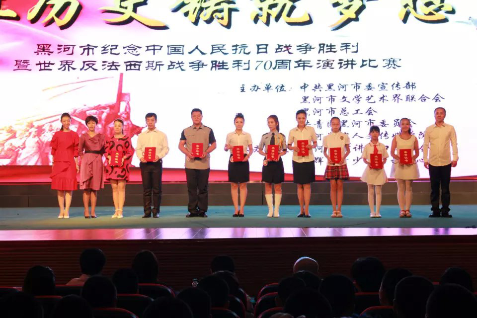 本网讯(学生记者 王艺璇)近日,“让历史铸就梦想”黑河市纪念中国人民抗日战争暨世界反法西斯战争胜利70周年演讲比赛在我校大礼堂隆重举行。