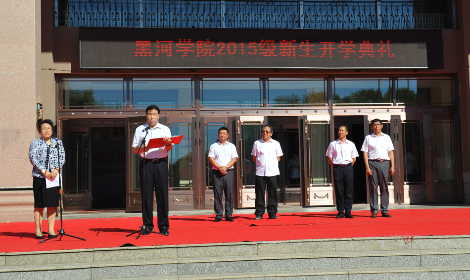 在雄壮的国歌声中,开学典礼拉开序幕。校长贯昌福代表全校师生员工对新生的到来表示热烈欢迎,向辛勤培育新生们的老师和家长们致以衷心的感谢。他说,从新生们踏入黑河学院第一天,就与学校的历史和未来紧紧联系在一起。今后的四年,新生将在黑河学院成长和进步,将与全体黑河学院人一起见证学校的发展,分享学校的荣誉,共同承担建设学校的责任。面对新学期、新生活,贯校长要求同学们要志存高远,自觉把个人理想与祖国命运结合起来,将个人目标与国家目标统一起来,把自己的精力投入到祖国发展的进程中;要砥砺品行,注重德行的培养和内在品格的塑造,培养高尚的品德;要知行合一,不断确立新的学习目标和奋斗方向,将所学的知识,创造性地运用于社会实践之中;要常怀感恩之心,以更为平和的心态,迎接未来,书写人生。