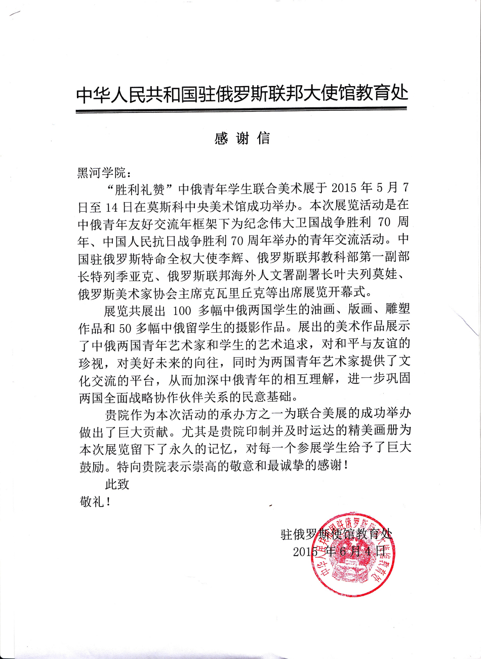 感谢信称,黑河学院作为活动的承办单位之一,印制并及时运达了精美画册为中俄青年联合美术展活动留下了永久记忆,对每一个参展学生给予了巨大的鼓励,对黑河学院表示崇高的敬意和诚挚的感谢。