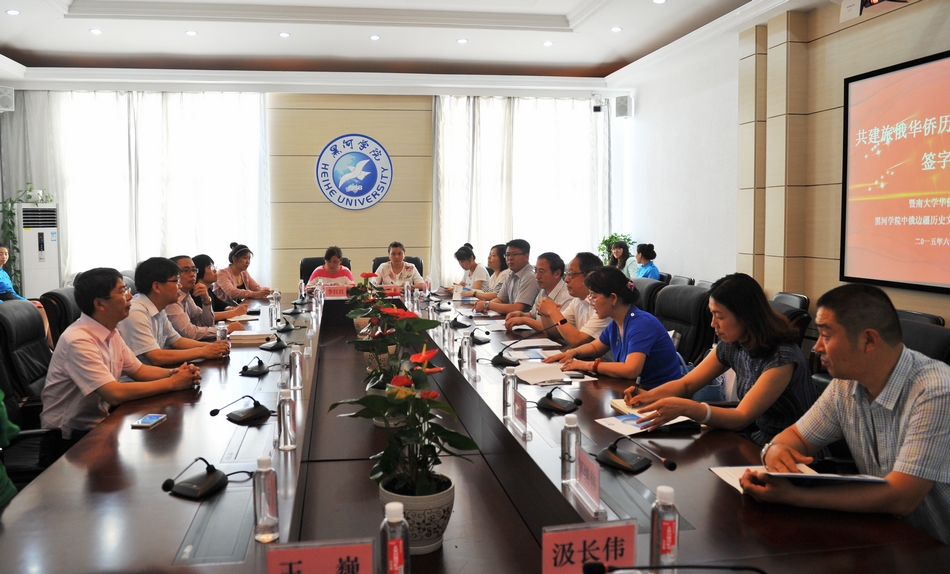 黑河市副市长、研究员鲁世巍博士;暨南大学华侨华人研究院院长、博士生导师曹云华教授,暨南大学华侨华人研究院副院长、博士生导师陈奕平教授及暨南大学华侨华人研究院相关专家、学者;我校副校长宋立权,中俄历史文化与社会发展研究中心主任谢春河教授及相关研究人员共同出席签约仪式。双方就人才培养、科研合作、联合调研、学术交流等事宜达成了基本共识。仪式由科研处处长宁艳红主持。