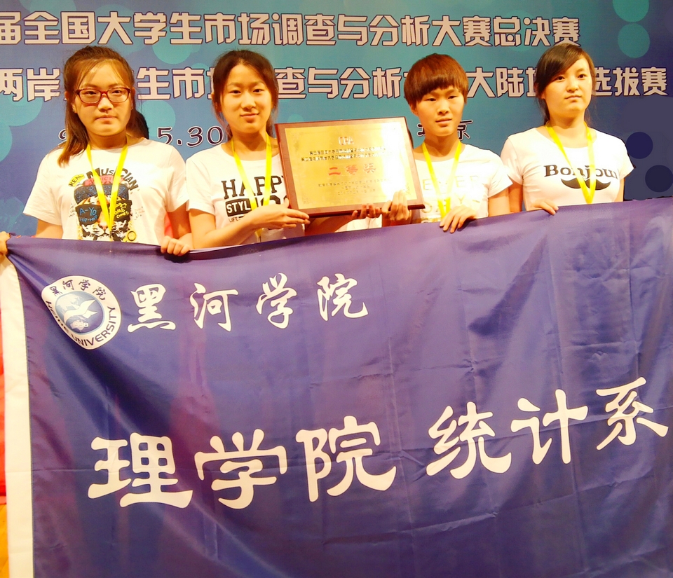 理学院2012级统计学专业罗欢、徐媛媛、陈雨和张凤岩四名学生组成的团队先后冲出全国海选,突围黑龙江省赛区,最终进入5月30日在北京举行的全国总决赛,并在总决赛中以优异的表现获得全国二等奖。