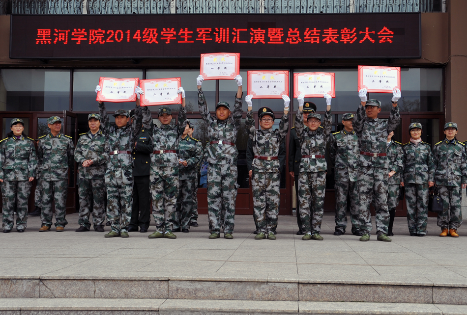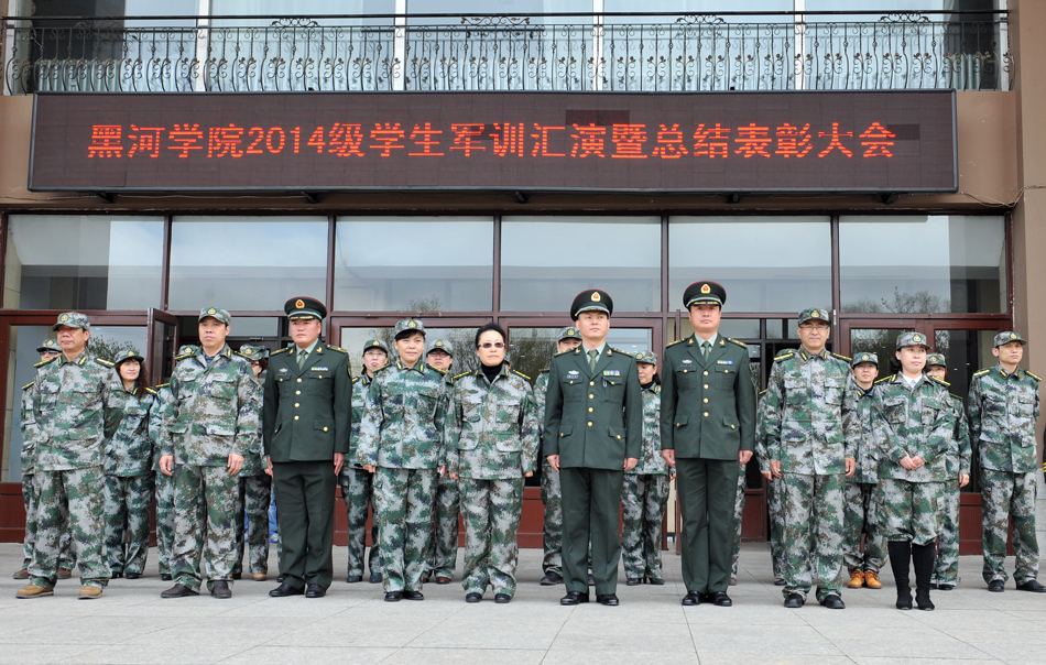 本网讯(记者 王佳 摄影 何振东)5月14日,我校2014级学生军训汇演暨总结表彰大会在明德楼前隆重举行。学校党委副书记、2014级学生军训大队大队长杨宏主持并宣读了学生投票评选出“最帅教官”名单,副校长、2014级学生军训大队大队长吕巧凤宣读了黑河学院2014级学生军训优秀教官名单;中国人民解放军65951部队副政委魏恒越宣读了2014级学生军训队列队形评比、内务卫生评比、作风纪律评比成绩。大会由学生工作部、武装部部长李明主持。