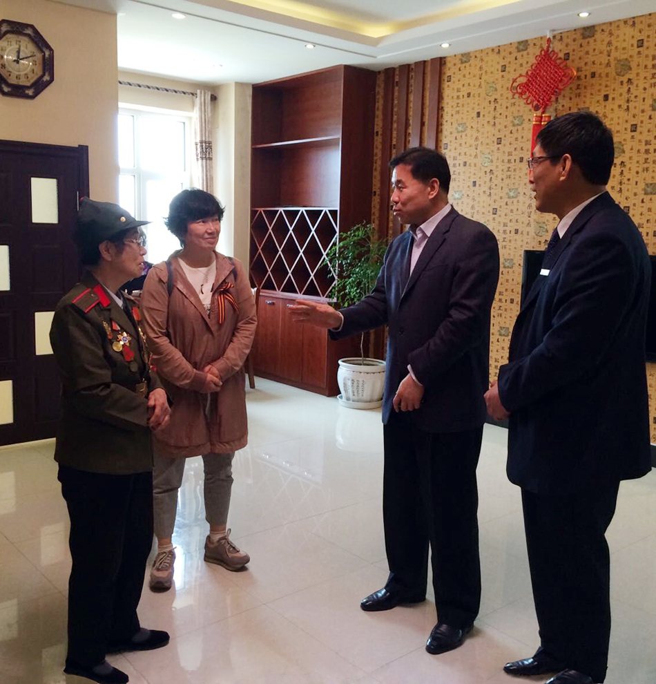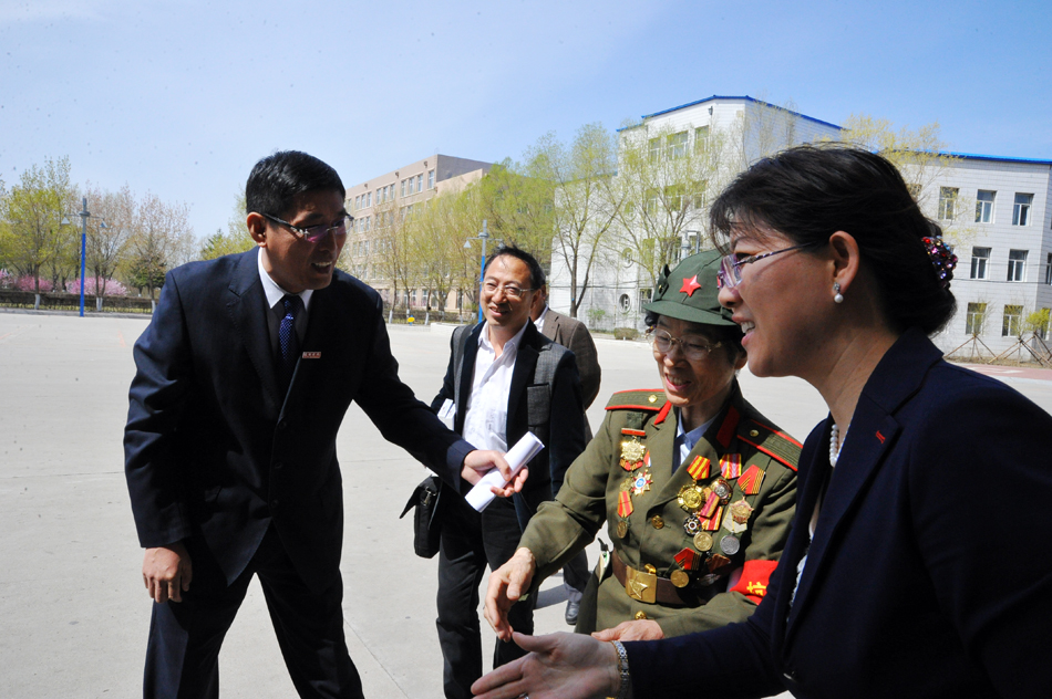 本网讯(记者 王佳 学生记者 郑承江)为纪念世界反法西斯战争胜利70周年,5月6日,学校邀请抗联老战士、原省政协副主席李敏来我校对旅俄华侨历史文化研究基地和正在建设的中苏抗日战争历史陈列馆进行实地调研。校长贯昌福热情接待了李敏一行。