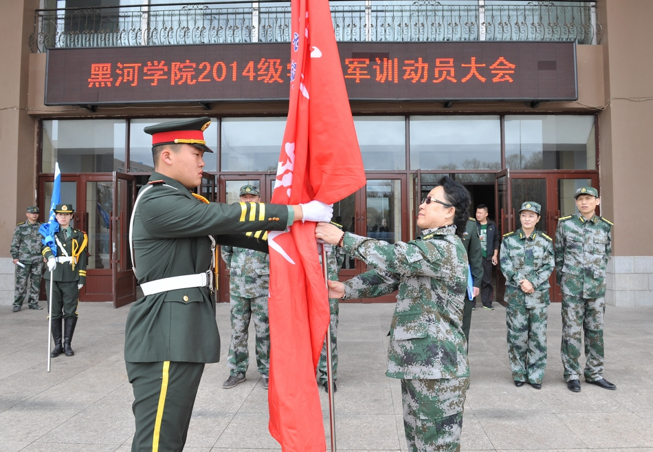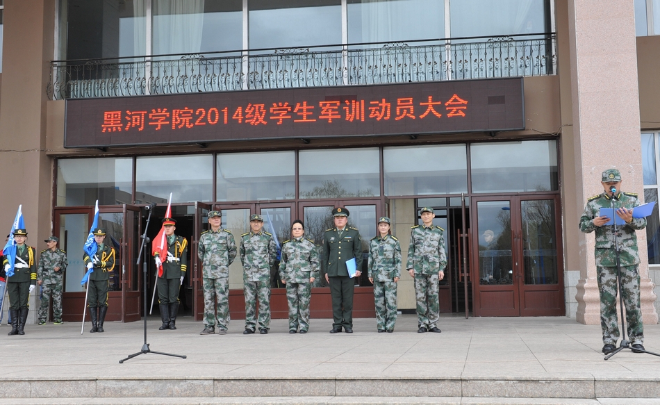动员大会上,学校党委副书记、2014级学生军训大队大队长杨宏为军训中队授旗。解放军65951部队训练大队教导员刘建华宣读了《黑河学院2014级学生军训计划》和《黑河学院2014级学生军训考核评比办法》。周方圆同学代表参训学生表达了完成军事训练的信心与决心。训练大队官兵们进行了队列等示范性表演,整齐的队列、扎实的基本功,赢得了全场师生热烈的掌声,为期10天的2014级新生军训工作随即全面展开。