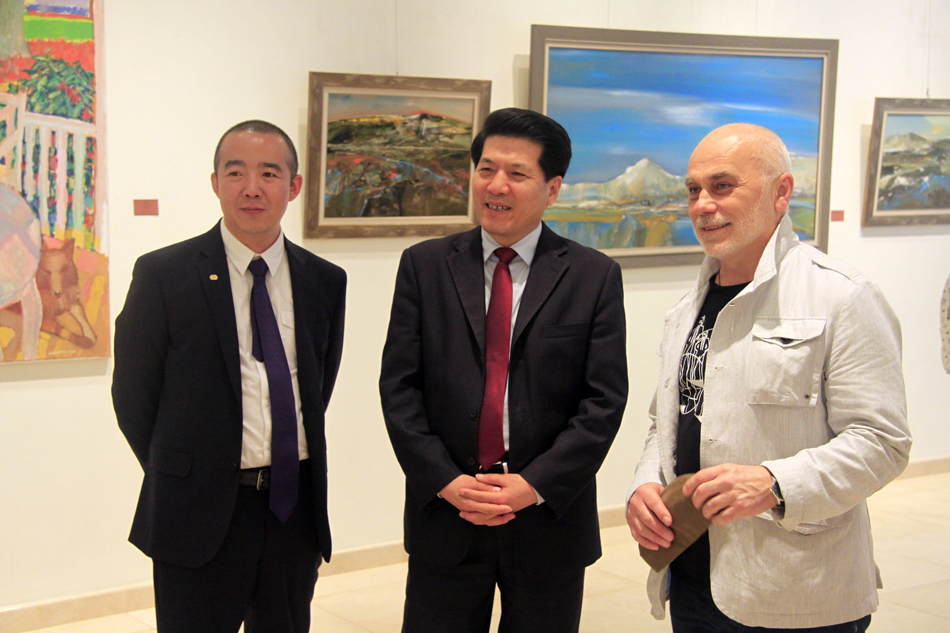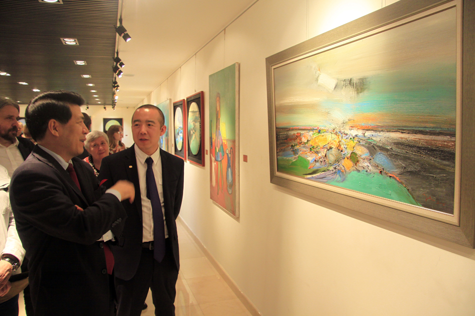 中华人民共和国驻俄罗斯联邦特命全权大使李辉与中俄画家联展“交融与和谐”主办人柳巴温、牟克共同欣赏画展