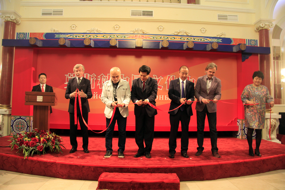中华人民共和国驻俄罗斯联邦特命全权大使李辉,中华人民共和国驻俄罗斯大使馆中国文化中心张中华公参与画展俄罗斯主办方负责人共同为活动剪彩