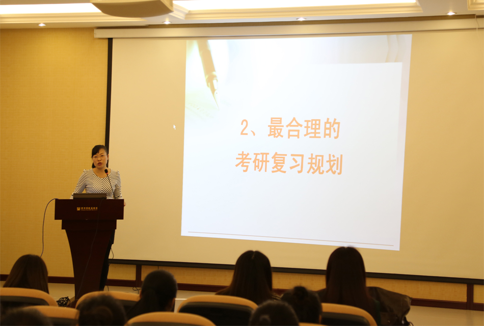 讲座中,张晓丽老师对近三年考研形势进行了分析,就考研的意义、流程,考试科目和研究生毕业就业情况进行了详细说明。张晓丽就考研院校及专业选择方面做了重点阐释,指导学生们制定合理有效的考研复习规划。
