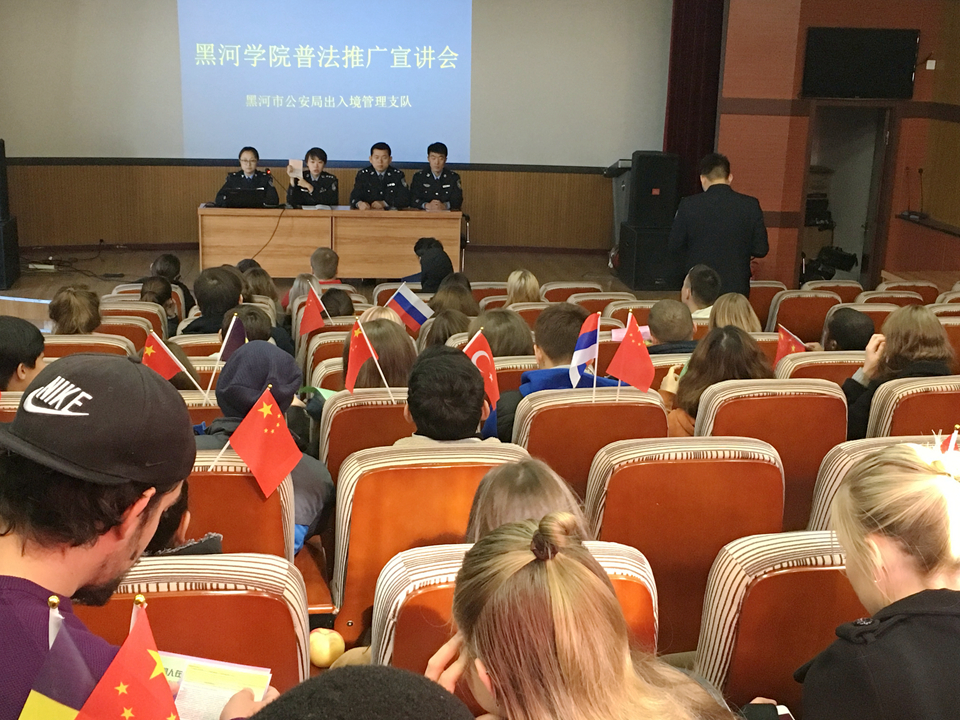 为了保障留学生在华学习和生活的安全,加强对留学生的出入境管理,黑河市公安局出入境管理支队的警官们为留学生作了安全讲座。警官们以真实的案例,结合最新出台的《中华人民共和国出入境法》,讲授了中国法律法规、签证办理、在华注意事项、交通安全、人身财产安全等内容,并对留学生提出的问题一一作了解答。