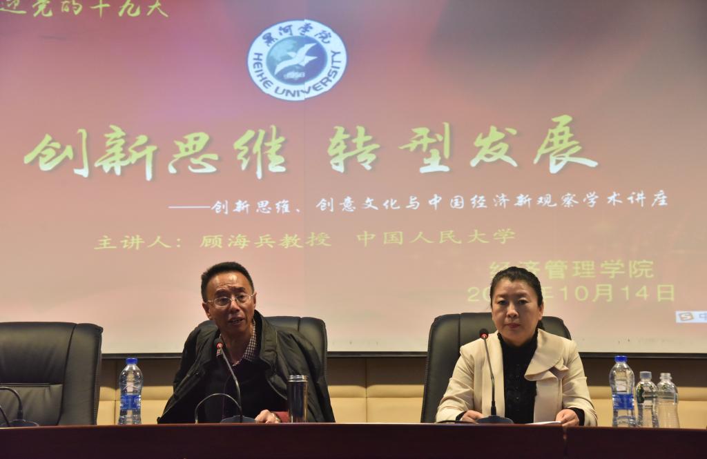 本网讯(特约记者 王小琬)为迎接党的十九大胜利召开,营造良好学术氛围,阐释“创新”发展理念,10月14日下午,我校特邀中国人民大学经济学院顾海兵教授作题为《创新思维、创意文化与中国经济新观察》的学术讲座。300余名师生聆听了讲座。经济管理学院党总支书记卢丽艳主持讲座。