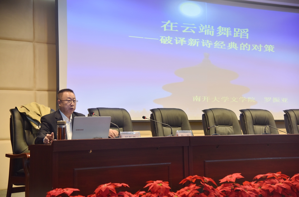罗振亚教授从“新诗读不懂”这个看似简单的问题入手,将诗歌的思维向度引向经典。讲座从“经典确立需要历史主观主义态度和立场、经典评判更应从审美维度出发,多向拓展研究方法,贴近经典文本实质”三个角度对经典作了全面立体的阐述。这一结构框架将我们从传统的经典理论中解放出来,为我们重新审视“经典”和“新诗”这两个问题提供了更为广阔和深远的维度。罗振亚教授采用文本细读的方式,对新诗作了新颖深刻的诠释,这一讲授方式能够让学生字斟句酌地感受诗歌的魅力。其博大的学识、贴切的用词、幽默的讲授风格赢得了师生们的阵阵掌声。