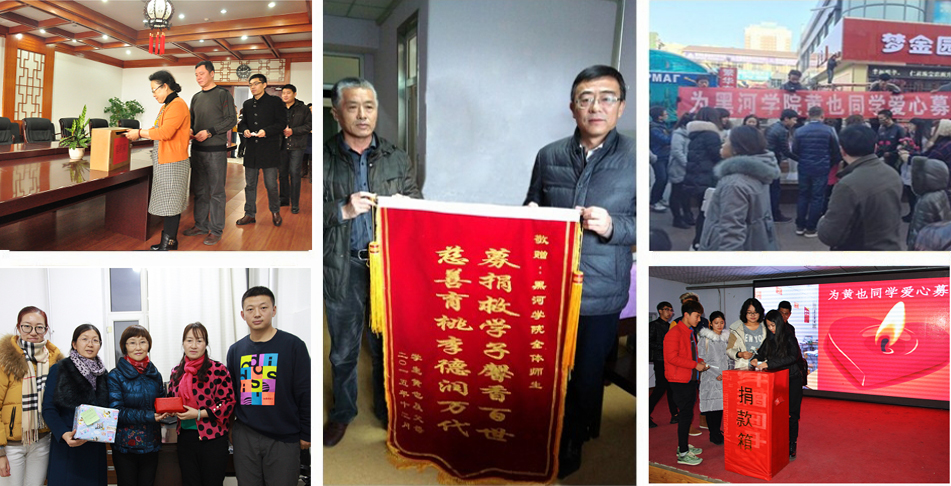 病魔折断的是追梦的翅膀,却没有剥夺被爱的权利。学校党政领导在听取体育学院关于黄也同学患病情况的汇报后,面对前来办理休学手续的黄也父母,作出了一个重要的决定,发动全校师生,集结全部力量帮助这名患病学子,来一次最为精准的帮扶,决不让渴望生命、渴望读书的黄也掉队。一场爱与厄运的对抗战在校园打响。由体育学院发起“帮帮我的同学”爱心帮扶倡议,全校师生们迅速行动起来,纷纷慷慨解囊,体育学院办公室几部电话不停的响起,学校领导,各学院、各部门老师打来电话,询问需要做些什么,怎样才能最快地把钱款捐给黄也;体育学院的学生干部利用课余时间手捧捐款箱走进商场、街道、社区进行爱心募捐;各学院的师生们以班为单位纷纷组织捐款活动。很多老师和同学通过银行账户汇款、微信转账等方式献出爱心后,依旧前来捐助。一批批善款化作一股股爱的暖流源源不断地输送到北京积水潭医院,短短一个月的时间全校师生聚沙成塔为黄也这名素未谋面的同学捐助爱心款竟达189729.3元。校学生工作部联合黄也所在二级学院体育学院还向黑河市红十字会、社保基金积极申请社会援助。在黄也实施换骨手术危急的24小时内,学校党委书记曹百瑛和体育学院党总支书记张玉萍、辅导员刘振涛老师亲自赶赴北京,探望刚刚推出手术室的黄也。黄也的父母感动得热泪盈眶,不停地说着“谢谢”。前来探病的曹书记仔细向主治医生询问病情以及后续治疗方案,并鼓励黄也同学要做打不死的“小强”,积极配合治疗,争取早日回归校园。