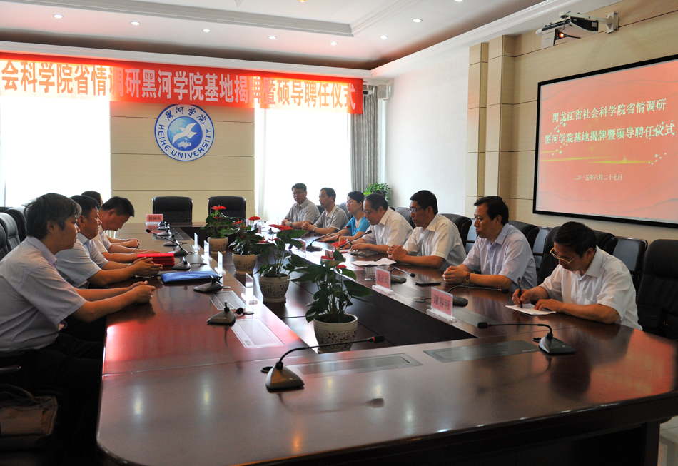 本网讯(记者 赵宇 摄影 王佳 王梓超)6月27日上午十点,黑龙江省社会科学院省情调研黑河学院基地揭牌暨硕导聘任仪式在我校明德楼二楼会议室隆重举行。黑龙江省社会科学院副院长刘爽,我校副校长宋立权共同为基地揭牌。揭牌仪式由副校长张焕强主持。