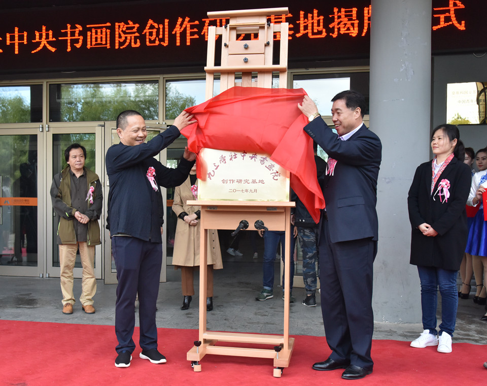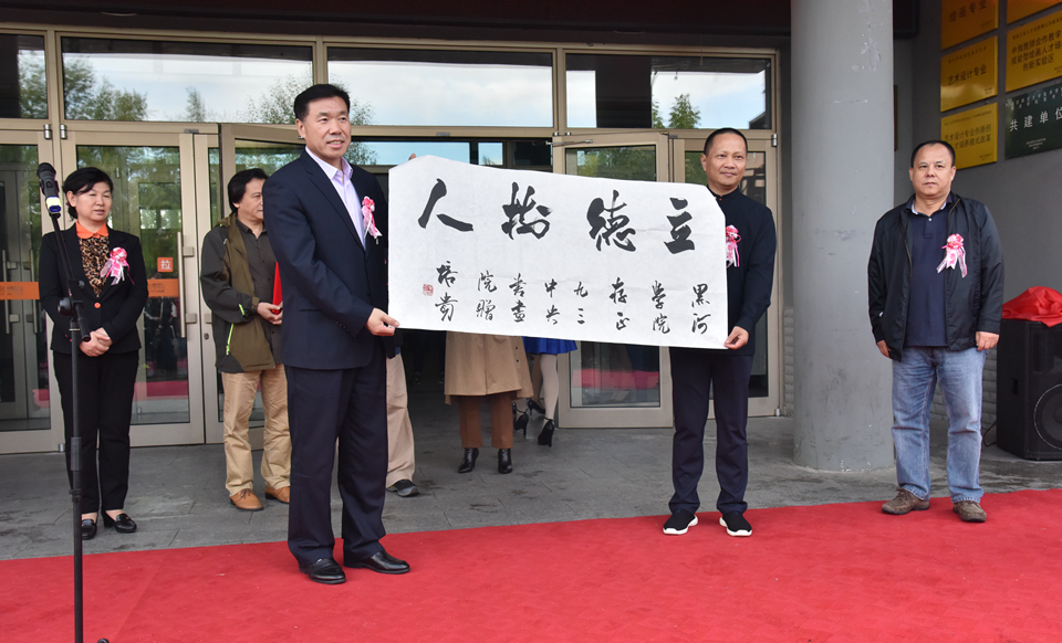 本网讯(记者 吴春娟)9月13日下午,九三学社中央书画院创作研究基地在我校揭牌成立。校长贯昌福与九三学社中央委员、九三学社中央书画院常务副院长、首都师范大学博士生导师叶培贵教授,九三学社中央文化委员、九三学社中央书画院副秘书长洪亮,九三学社中央书画院副秘书长王贵华、李小麟,九三学社中央书画院院务委员刘文哲及市政府副市长、民盟黑河市委主委陈晓杰,市委统战部副部长、市工商联党组书记张秀杰共同出席揭牌仪式。我校美术与设计学院百名师生参加揭牌仪式。