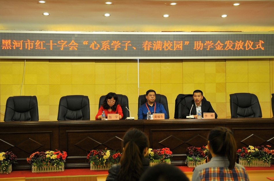 本网讯(特约记者 姜辉 摄影 何振东)3月23日下午,黑河市红十字会“心系学子 春满校园”助学金发放仪式在明德楼五楼多功能厅举行。黑河市红十字会副会长黄福生、我校学生工作部部长李明及受助学生参加仪式。仪式由学生工作部副部长包宇主持。