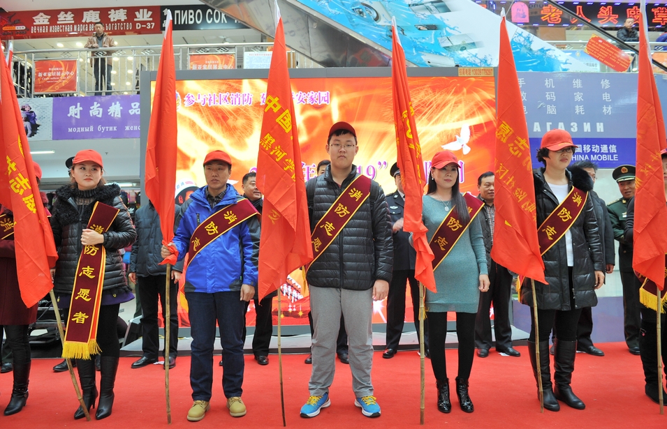 本网讯(特约记者 张铎 摄影 赵宇 刘思佳)为全面深入开展“119消防日”宣传活动,切实增强全民的消防安全意识,11月6日上午,我校副校长车永宏率领40名大学生消防志愿者参加了黑河市政府在华富商城一楼举办的主题为“参与社区消防 建设平安家园”2015年119消防日活动。黑河市委常委、副市长潘杨,黑河市政协副主席、市公安局党委书记、局长李晓龙,市安监局局长袁亚东,共青团黑河市委员会书记付振南,黑河市文明办副主任詹大伟,黑河市公安局副局长姜伟斌,黑河市消防支队支队长张国祥,政委毕永军及各社区消防志愿者代表共同参加了本次活动。