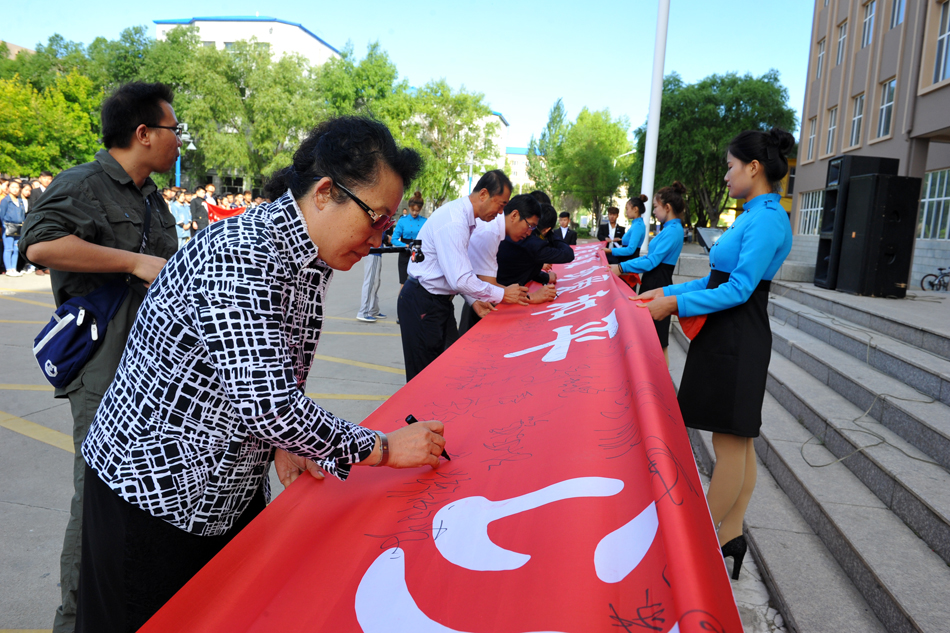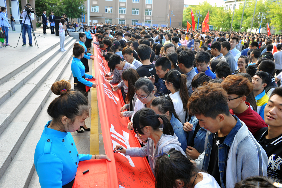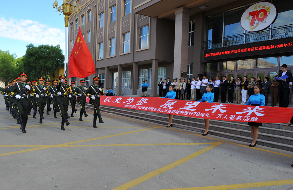 本网讯(记者 王佳 赵宇)9月3日上午,我校党委宣传统战部、团委、中俄边疆历史文化与社会发展研究中心联合举办了主题为“勿忘国耻 珍爱和平 以史为鉴 展望未来”的纪念中国人民抗日战争暨世界反法西斯战争胜利70周年万人签名活动。俄罗斯阿穆尔州副主席帕拉托夫、布拉戈维申斯克市议长雷先科、阿穆尔州老年人协会和布拉戈维申斯克市老战士协会的32名老战士,黑河市委常委、宣传部长姜福,黑河军分区政委白景新,黑河市人大副主任、市总工会主席何宝顺,黑河市政协副主席、市公安局局长李晓龙,黑河市文管会主任吴玉燕等领导到校参加活动;我校党委副书记杨宏、党委副书记兼工会主席李廷栋、副校长张焕强、车永宏和万名师生参加签名活动。