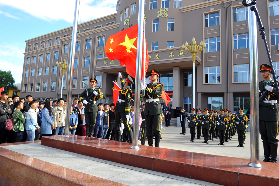 在庄严的国歌声中,国旗缓缓升起,全体师生在国旗下齐声宣誓:铭记历史、珍爱和平、奋发成才、报效祖国。