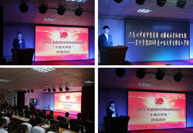 评选活动自2014年12月份开展以来,各系(中心)积极响应,经过组织推荐、内部联评等环节,共有16名大学生入围2014年度感动校园“十佳大学生”候选人。经过微信平台投票、现场演讲与VCR展示、现场投票,最终俄语系杨凯、教育系孟洁、历史文化旅游系何欣颐等10名同学入选黑河学院2014年度感动校园“十佳大学生”。