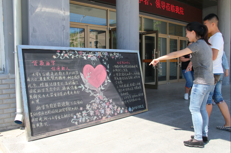 资助诚信板报宣传从5月20日开始,通过院内宣传板报的形式对国家助学贷款及其他资助政策进行广泛宣传,普及征信、金融等相关知识,宣讲诚实守信事迹,倡导契约精神,让同学们在了解国家助学贷款政策的同时树立诚信观念、珍惜个人信用记录,增强法律意识,及时履行国家助学贷款合同,有效地将诚信教育转化为大学生自觉的素养与行为等。本次宣传活动为期7天,其活动地点选择在人流量比较密集的学院主楼。