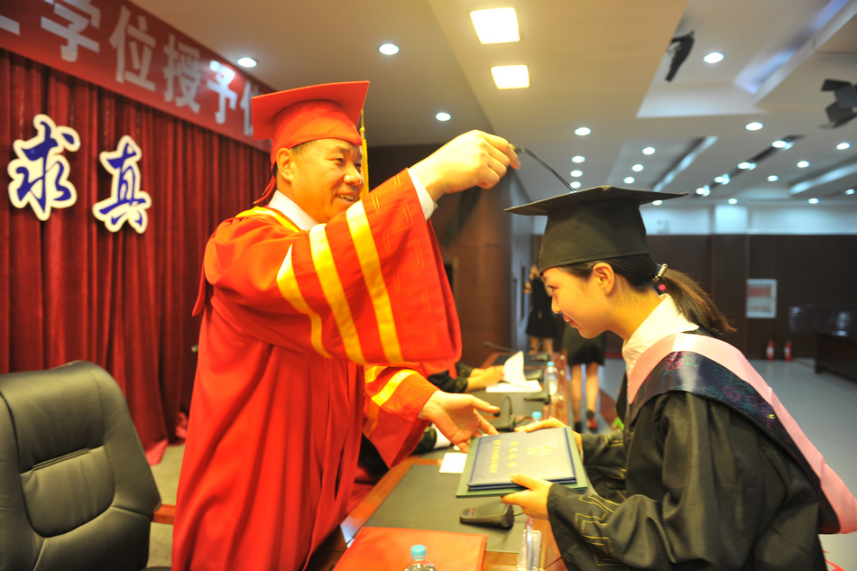 在《黑河学院院歌》声中毕业典礼拉开帷幕。校长贯昌福为毕业生代表文化旅游学院2012级历史学专业学生何欣颐拨流苏,颁发学位证书和毕业证书,并代表学校对圆满完成学业的同学们表示热烈的祝贺,向多年来为学生健康成长付出辛勤劳动的广大教职工表示崇高的敬意。他说,大学是人生的最美好的时光,大学阶段奠定了未来事业发展的坚实基础。四年前,同学们怀揣着梦想进入黑河学院,四年中,同学们在学习中转变,在转变中成熟,取得的优异成绩和为学校赢得的荣誉是毕业生留给学校最好的礼物。贯校长勉励毕业生要珍惜时代赋予的使命,做一个志存高远、追求卓越的人,做一个品德高尚、懂得感恩的人,做一个明理诚信、敢于担当的人,做一个谦虚谨慎、勤学善思的人,在实现中华民族伟大复兴中国梦的征途上奉献聪明才智,成就自己的梦想。