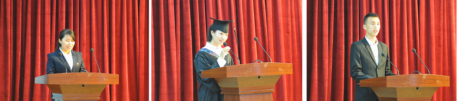 理学院张秀平代表全体教师深情回顾了四年来老师和同学们共度的美好时光,希望毕业生不管走到哪里,都要一如既往关注学校的发展,常回家看看;人文传媒学院孔彩霞代表毕业生表达了对母校的培养及老师教导的感激之情,并表示走入社会后一定会牢记老师们的嘱托,不辜负母校的期望;计算机与信息工程学院学生王举代表在校生向全体毕业生表达美好祝愿,并承诺要以学长为榜样,刻苦学习,勤于实践,勇于创新,争取早日成才。