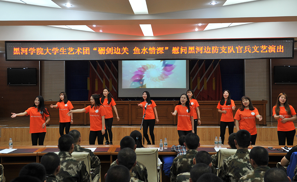 在黑河边防支队,大学生艺术团举行了“砺剑边关 鱼水情深”为主题的文艺演出。铿锵有力的诗朗诵、诙谐幽默的小品、热情奔放的街舞、温婉优雅的现代舞等精彩节目,为部队官兵们送去了一道丰盛的精神文化大餐,活跃了官兵们的军营文化生活,博得了官兵的热烈欢迎和一致好评。
