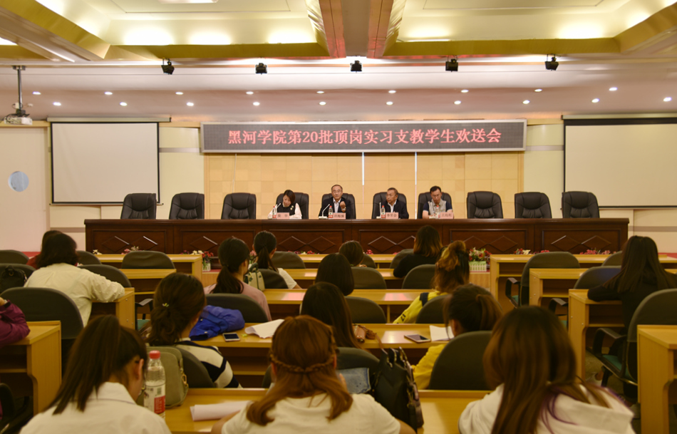 本网讯(特约记者 周国忠)9月1日下午,学校在明德楼五楼多功能厅举行第二十批顶岗实习支教学生欢送会,62名学生将陆续前往黑河市各县(市、区)和部分农场的26所中小学开展顶岗实习支教工作。副校长许海深、黑河市教育局调研员李军会、师资科科长王均利与顶岗实习支教驻县教师出席会议。会议由教务处处长柴华主持。