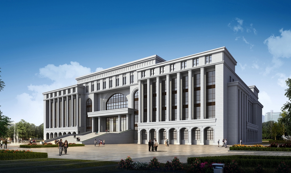 位于校园中轴线上端点的图书馆,毗邻月牙湖公园,是整个校园的中心建筑,总建筑面积20897.54㎡,设计藏书量100万册。新图书馆2016年开工,主体建设已经完工,目前正进行内部施工,预计2018年9月校庆六十年之际交付使用。